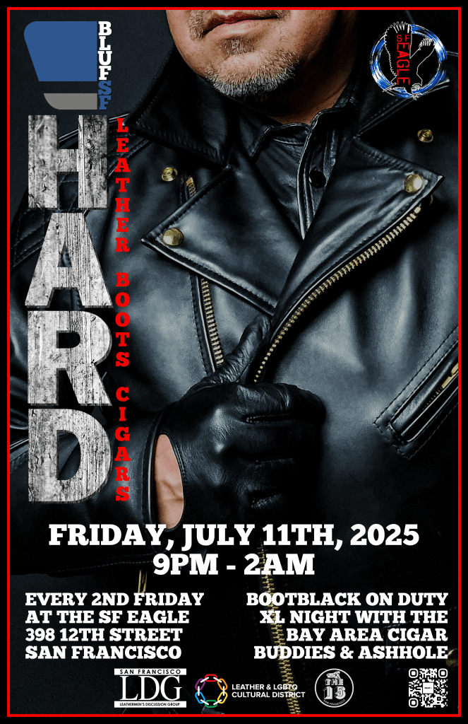 Join us for the July edition of BLUFSF HARD at the SF Eagle from 9PM to 2AM; arrive in gear before 9:30PM and pay no cover. Gear up, show up, get your boots serviced by the on-duty Bootblack.