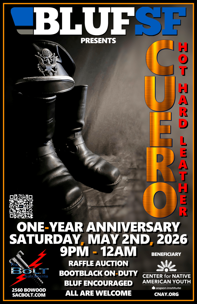 BLUFSF CUERO begin in May 2025 following a successful collaboration with 2025 Mr. Bolt Leather Colin Gallagher in March 2025. CUERO is a sibling event to BLUFSF HARD and is held at the Bolt, Sacramento’s Leather bar.